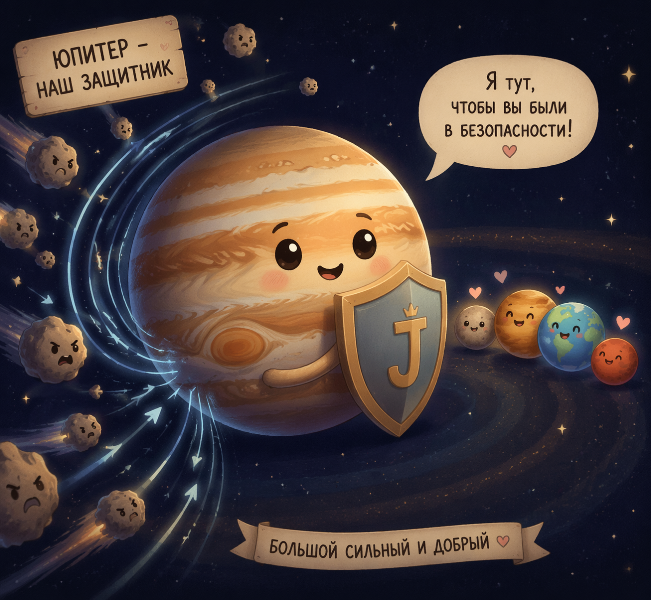Крупные астероиды не падают на Землю каждый день из-за гравитации Юпитера, притягивающего астероиды, защищая внутренние планеты